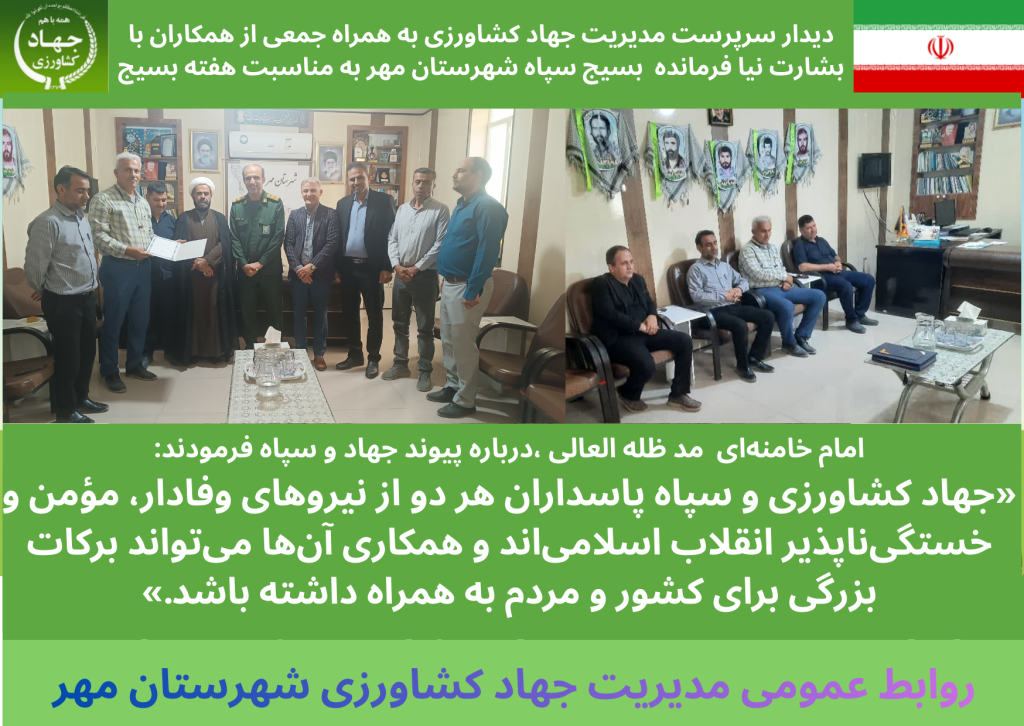 دیدار سرپرست مدیریت جهاد کشاورزی به همراه جمعی از همکاران با بشارت نیا فرمانده بسیج سپاه شهرستان مهر به مناسبت هفته بسیج