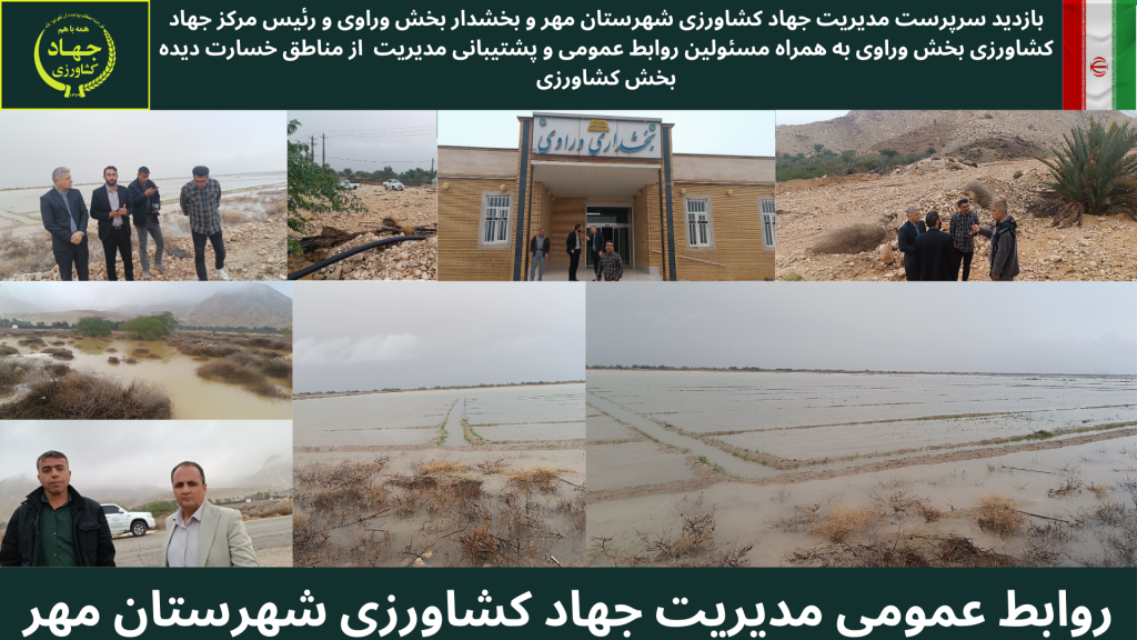 گزارش تصویری بازدید سرپرست مدیریت جهاد کشاورزی شهرستان مهر و بخشدار بخش وراوی و رئیس مرکز جهاد کشاورزی بخش وراوی به همراه مسئولین روابط عمومی و پشتیبانی مدیریت از مناطق خسارت دیده حوزه کشاورزی در بخش وراوی