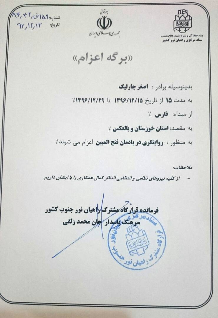 - اعزام جناب آقای علی اصغر چالیک (جانباز 65 درصد و فرماندهان پشتیبانی مهندسی رزمی جنگ جهاد فارس) به مناطق جنوب
