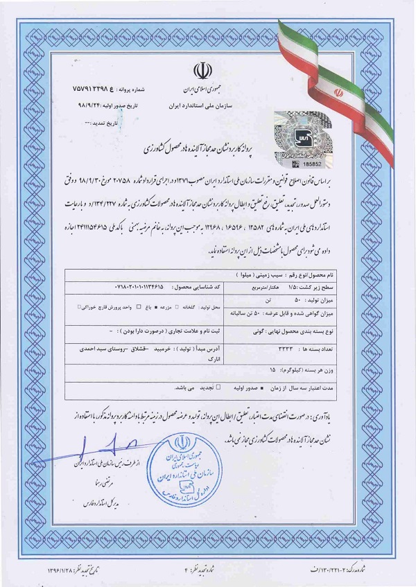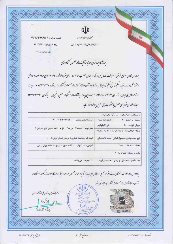 این مقام مسئول به روند ملی دریافت پروانه کاربرد نشان حدمجاز آلاینده ها در محصولات کشاورزی در قالب استاندارد تشویقی که شامل ثبت نام در پایگاه اطلاع رسانی محصولات گواهی شده و ارگانیک به آدرس cerganic.maj.ir ، انتخاب مدیر کنترل کیفی و شرکت بازرسی است، اشاره نمود و خاطر نشان کرد: در این پروسه پس از تایید مراکز خدمات جهاد کشاورزی و انعقاد قرارداد با یکی از مدیران کنترل کیفی جهت نظارت بر مزارع یا باغات و سایر سایت های تولیدی از ابتدا تا زمان برداشت محصول و انعقاد قرارداد با یکی از شرکت های بازرسی مورد تایید سازمان استاندارد، قبل از برداشت محصول، نمونه برداری توسط شرکت بازرسی انجام و نمونه ها به آزمایشگاه همکار استاندارد و معتمد سازمان تحویل می گردد که در صورت منطبق بودن آزمایشات و طرح در کمیته علائم، اداره کل استاندارد نسبت به صدور پروانه استاندارد تشویقی اقدام می نماید.